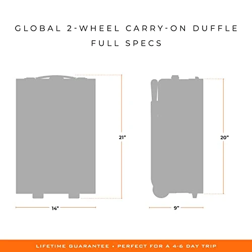 Details: The Global 2-Wheel Carry-On Duffle Bag (21″ x 14″ x 9″) meets carry-on regulations for most U.S. domestic airlines. The retractable, low profile side carry handle and integrated bottom fabric handle offers different ways to hold your luggage. It also comes with a Powerpocket™ to conveniently store battery pack and cell phone for charging on the go. High-density wheels offer superb smooth rolling. Encasing in impact resistant material to increase protection, while ensuring durability for countless miles. Designed with self-repairing YKK RC zippers call for smooth zipper action with lockable zipper pulls. Bag can be cleaned with a soft, damp cloth or an adhesive lint brush roller. If your bag is ever broken or damaged, we’ll repair it free of charge, no proof of purchase needed, no questions asked.