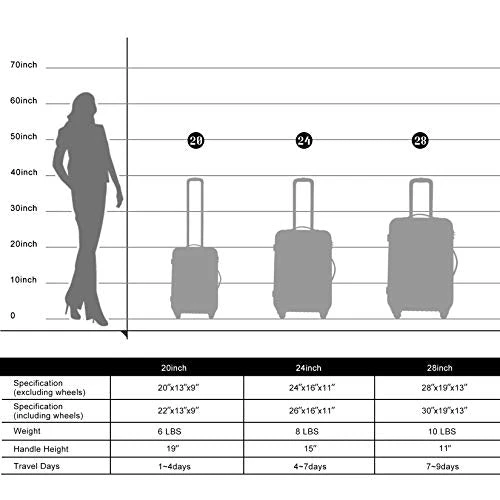 Details: Designed to provide travelers comfort, functionality, reliability, and peace of mind, this 3 piece suitcase set features one 28inch expandable suitcase for consignment, one 24inch expandable suitcase for checking in and one 20inch suitcase(not expandable) suitable for carrying onto the plane. Constructed with lightweight durable ABS + PC color masterbatch hard shell material, this luggage is durable, flexible and can absorb impact when under stress. Quiet airplane spinner wheels and an adjustable 3-level telescoping handle allow you to quickly maneuver in tight spaces and provide effortless movement. Unique hardshell material not only protect your belongings, but also enhance overall durability. Hide any potential scratches or scuffs from your journeys with elegant embossed patterns. With the included 3- digit combination lock, you can also secure your valuables from thieves. Make packing clothes easy with the interior fully lined with multi-use organizational pockets.