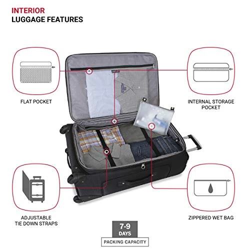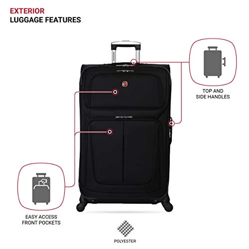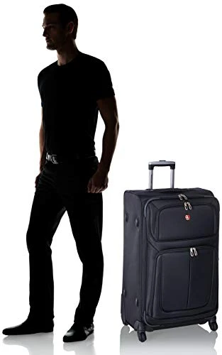 Details: The SWISSGEAR 6283 29″ Expandable Spinner Luggage features a locking push/pull handle system and four 360-degree spinner wheels for superior mobility. Made of durable, scuff-resistant polyester fabric, its interior is fully lined and features adjustable luggage tie-down straps, a removable zippered wet bag, a large mesh lid pocket, and a packing pocket for holding small items and accessories. Other features include two front panel pockets, a built-in ID tag, and padded top grab handle.