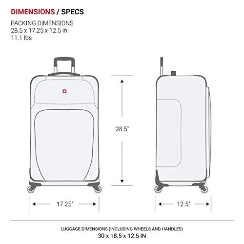 - DIMENSIONS: Packing Dimensions: 28.5β x 17.25β x 12.5β; Product Dimensions (includes wheels and handles): 30β x 18.5β x 12.5β; Weight: 11.1 lbs