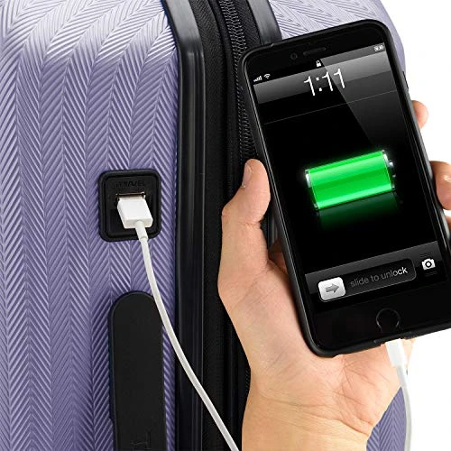 - 22″ spinner features a built-in USB port and interior power bank compartment that provide quick connection to your portable electronic device for a quick charge.