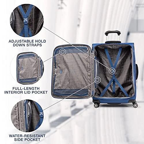 Details: Take this 3- piece spinner set for a spin. The Travelpro®AutoPilot™ 2.0 3-Piece Expandable Spinner Set” Expandable lets you pack for a week or more with a tapered expansion option that gives you up to 2” more packing capacity in a tip-resistant design. Plus, the interior lid pocket, water-resistant side pocket and adjustable hold down straps keep everything organized and in its place. A honeycomb frame system provides durability without extra weight, while the unique bottom tray construction helps align and stabilize the eight 360° spinner wheels–for effortless maneuverability and enhanced toughness. A telescoping extension handle adjusts to users of different heights and features an ergonomic, Patented Contour Grip for a great handhold and easy steering. Treated to resist moisture and stains inside and out, this bag is built to last and backed by our Limited Lifetime Warranty