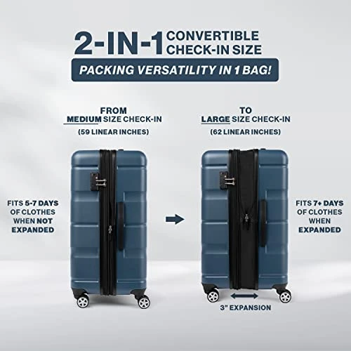 - The Convertible Medium-Large Checked Spinner in this hardside luggage set is a medium-sized bag that features a unique 3” expansion option that increases the bag’s capacity and size to a large check-in spinner (62 linear inches). Carry on suitcase has a 2″ expansion option for added capacity.